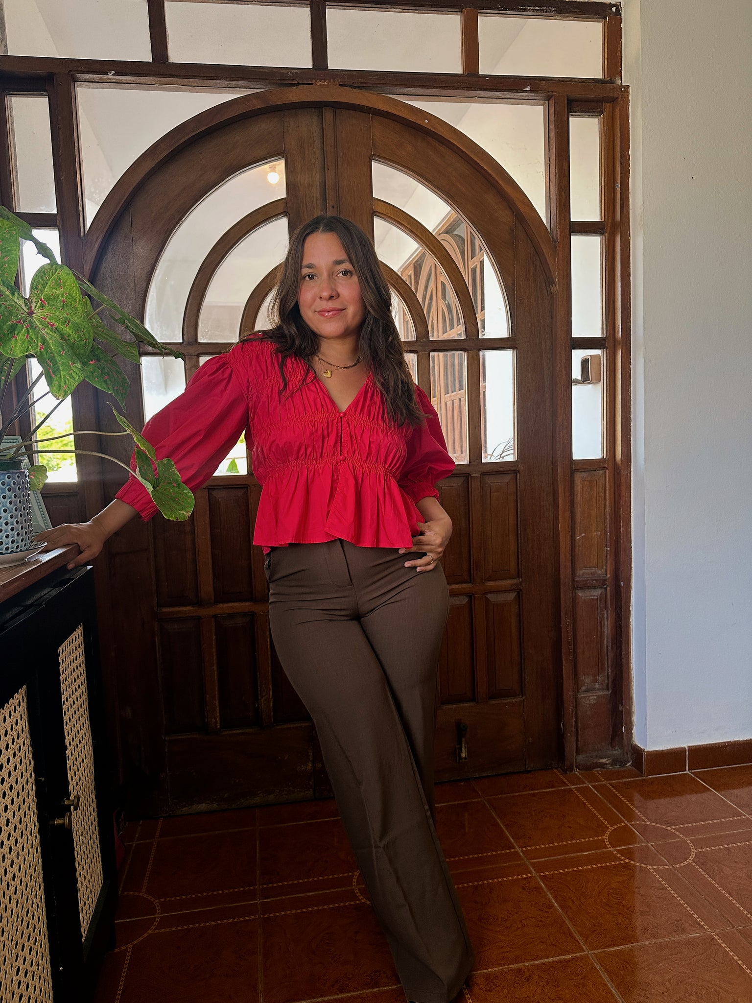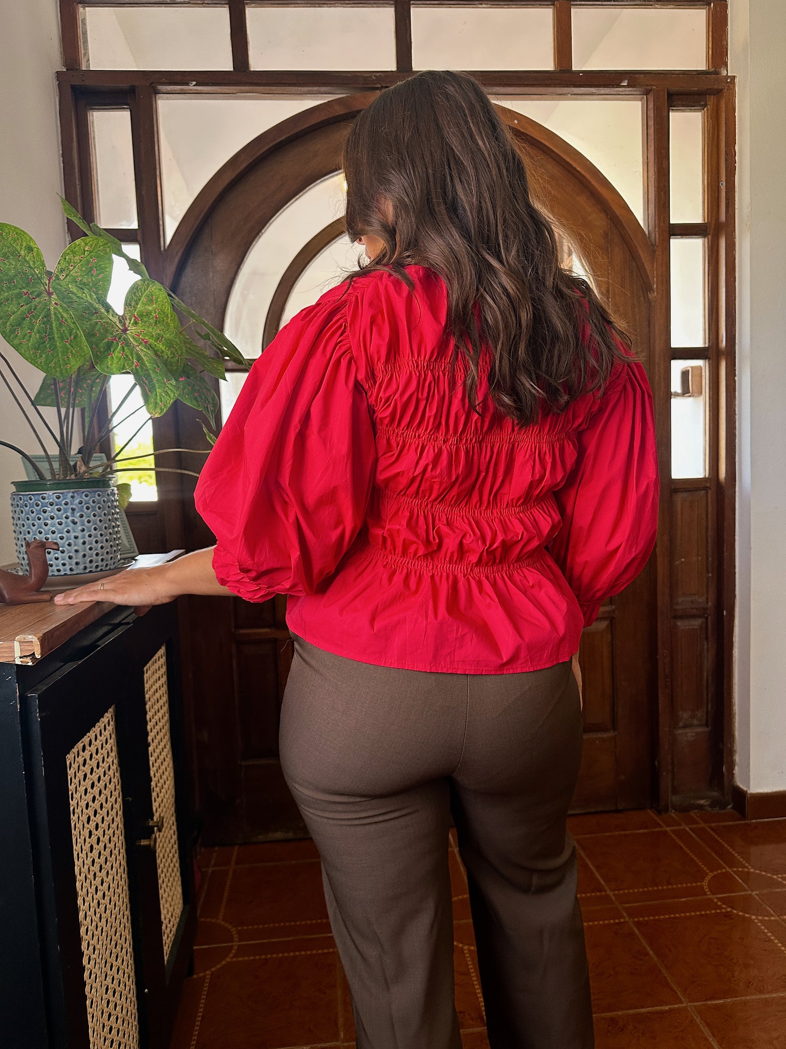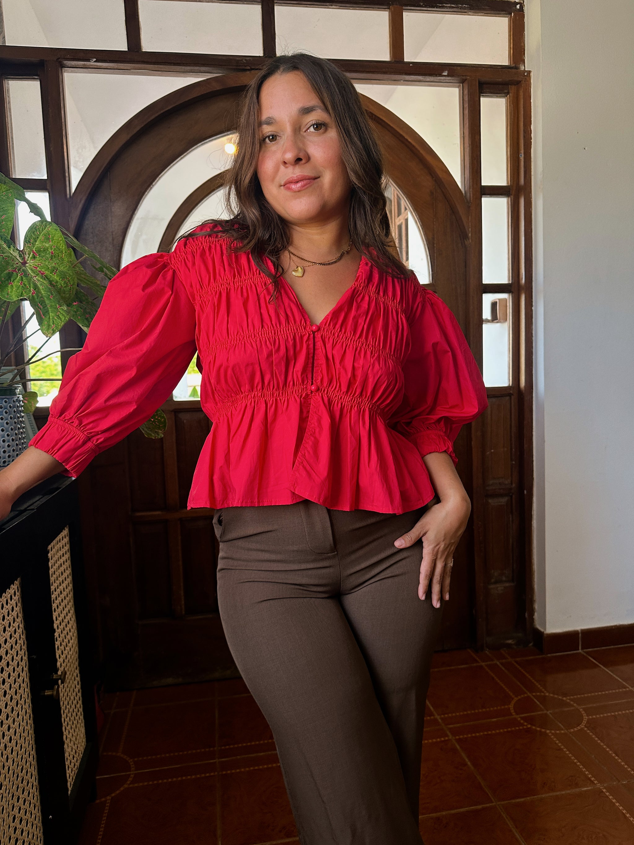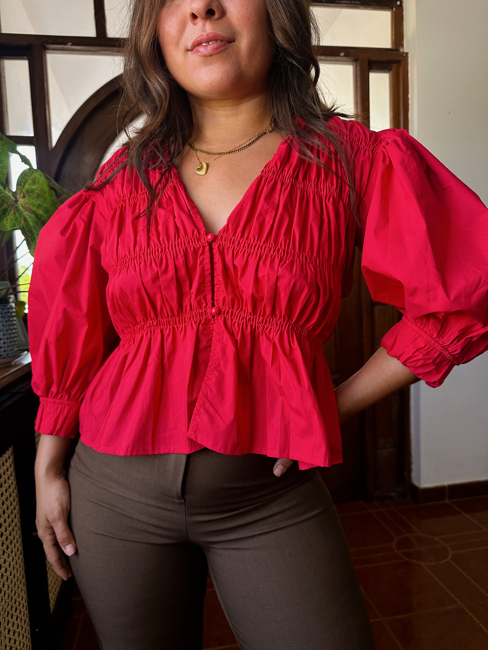 Our Jimena Top features a button down and a bubble sleeve Woven
